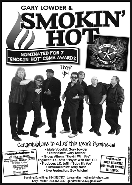 A seven piece R&B , Soul , Rhythm & Blues collection of some of the hottest players in the business. .... A Carolina Beach Music award winner for solo CD of the year Soul Therapy 2013 ...Gary Lowder, leads this all star veteran cast featuring: Terry Nash on keys, Curley White on Bass guitar, JK Loftin on lead guitar, Dan Thomas on Drums, Don Colton on sax, and Keith Stone on trumpet!. "Soul Therapy "... by Gary Lowder & Smokin' Hot has received CD of the year from the CBMA (Carolin Beach Music Association.... Other nominations include : Entertainer of the year, Male vocalist of the year, & Producer of the year..from the CBMA....